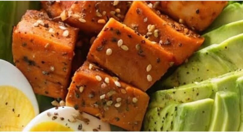 Prepare the salmon: In a bowl, mix soy sauce, chili paste, and sesame oil. Coat the salmon cubes and pan-sear for 3–4 minutes until golden. Sprinkle sesame seeds.